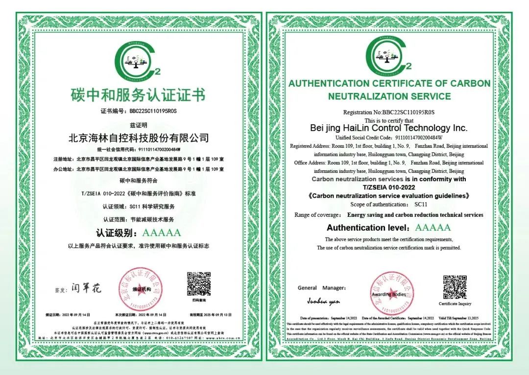 經(jīng)過(guò)我司不斷完善、不懈努力,已成功領(lǐng)取“碳中和用戶服務(wù)AAAAA級(jí)認(rèn)證證書”,碳中和服務(wù)認(rèn)證分為五個(gè)等級(jí),即A、AA、AAA、AAAA、AAAAA級(jí),等級(jí)越高說(shuō)明企業(yè)綜合實(shí)力和服務(wù)水平越高。此次評(píng)審,海林自控榮獲最高級(jí)別碳中和服務(wù)認(rèn)證。
