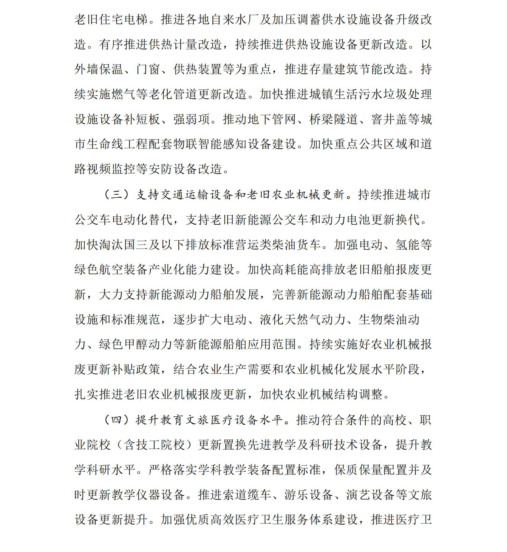 (二)加快建筑和市政基礎(chǔ)設(shè)施領(lǐng)域設(shè)備更新。圍繞建設(shè)新型城鎮(zhèn)化,結(jié)合推進(jìn)城市更新、老舊小區(qū)改造,以住宅電梯、供水、供熱、供氣、污水處理、環(huán)衛(wèi)、城市生命線工程、安防等為重點,分類推進(jìn)更新改造。加快更新不符合現(xiàn)行產(chǎn)品標(biāo)準(zhǔn)、安全風(fēng)險高的老舊住宅電梯。推進(jìn)各地自來水廠及加壓調(diào)蓄供水設(shè)施設(shè)備升級改造。有序推進(jìn)供熱計量改造,持續(xù)推進(jìn)供熱設(shè)施設(shè)備更新改造。以外墻保溫、門窗、供熱裝置等為重點,推進(jìn)存量建筑節(jié)能改造。持續(xù)實施燃?xì)獾壤匣艿栏赂脑?。加快推進(jìn)城鎮(zhèn)生活污水垃圾處理設(shè)施設(shè)備補短板、強弱項。推動地下管網(wǎng)、橋梁隧道、窨井蓋等城市生命線工程配套物聯(lián)智能感知設(shè)備建設(shè)。加快重點公共區(qū)域和道路視頻監(jiān)控等安防設(shè)備改造。