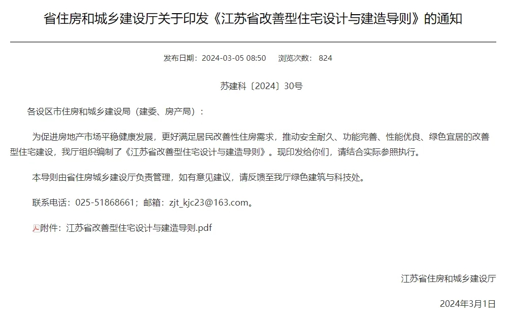 江蘇省出臺(tái),省住房和城鄉(xiāng)建設(shè)廳關(guān)于印發(fā)《江蘇省改善型住宅設(shè)計(jì)與建造導(dǎo)則》的通知,推動(dòng)安全耐久、功能完善、性能優(yōu)良、綠色宜居的改善型住宅建設(shè),品質(zhì)住宅有大變化!