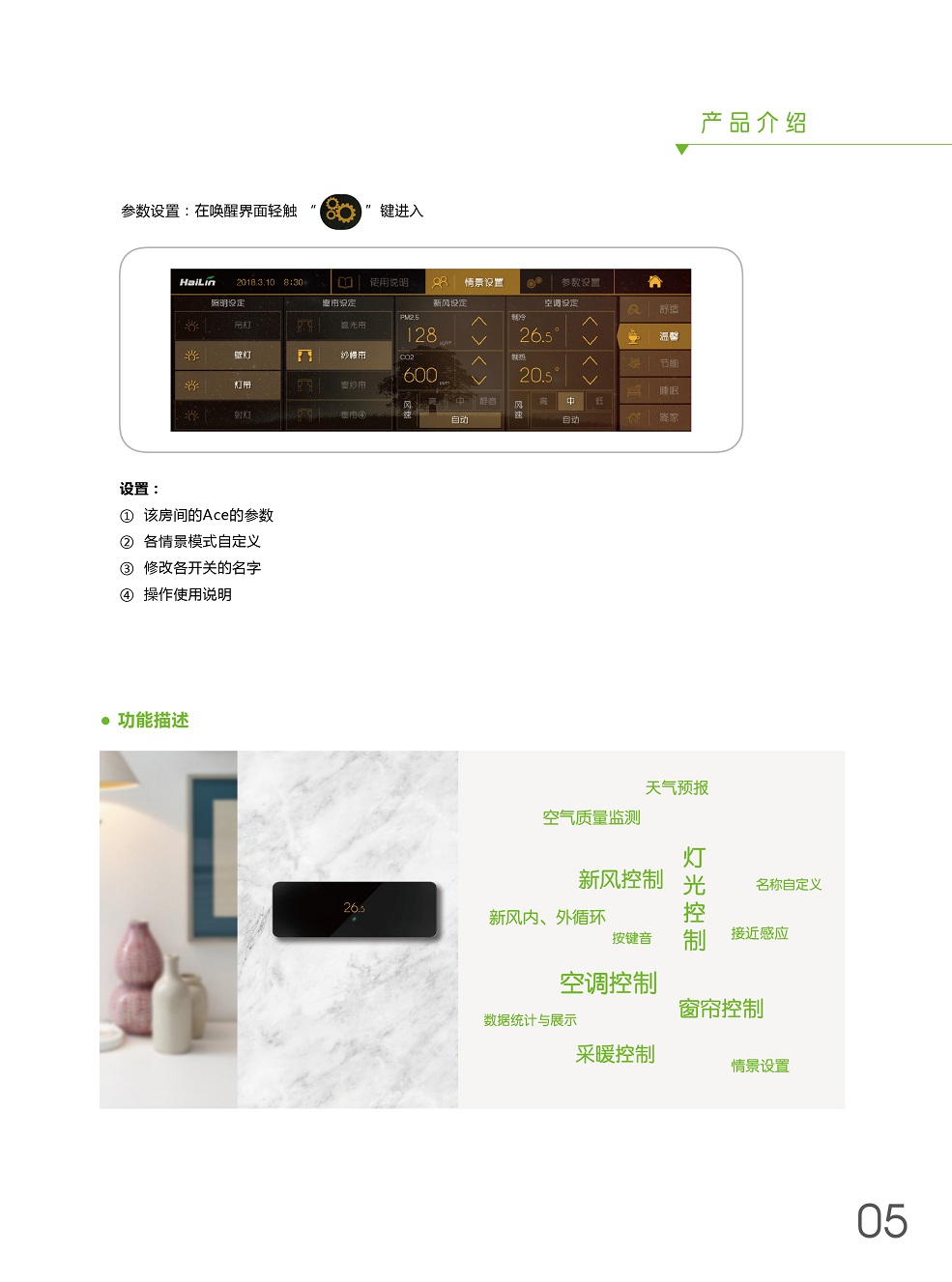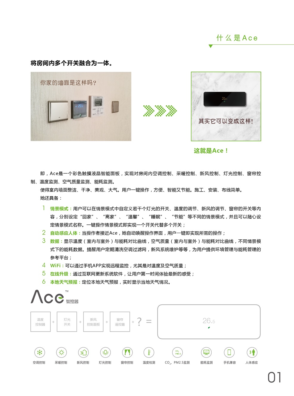 ACE將溫度控制、燈光控制、窗簾控制、新風(fēng)控制、空氣檢測集于一身,采用控制模塊集中控制,控制面板弱電連接方式,極大程度減少布線及人工成本。ACE+自學(xué)習(xí),不斷優(yōu)化用戶使用習(xí)慣,減少生活浪費,ACE就是您身邊的隱形管家。
