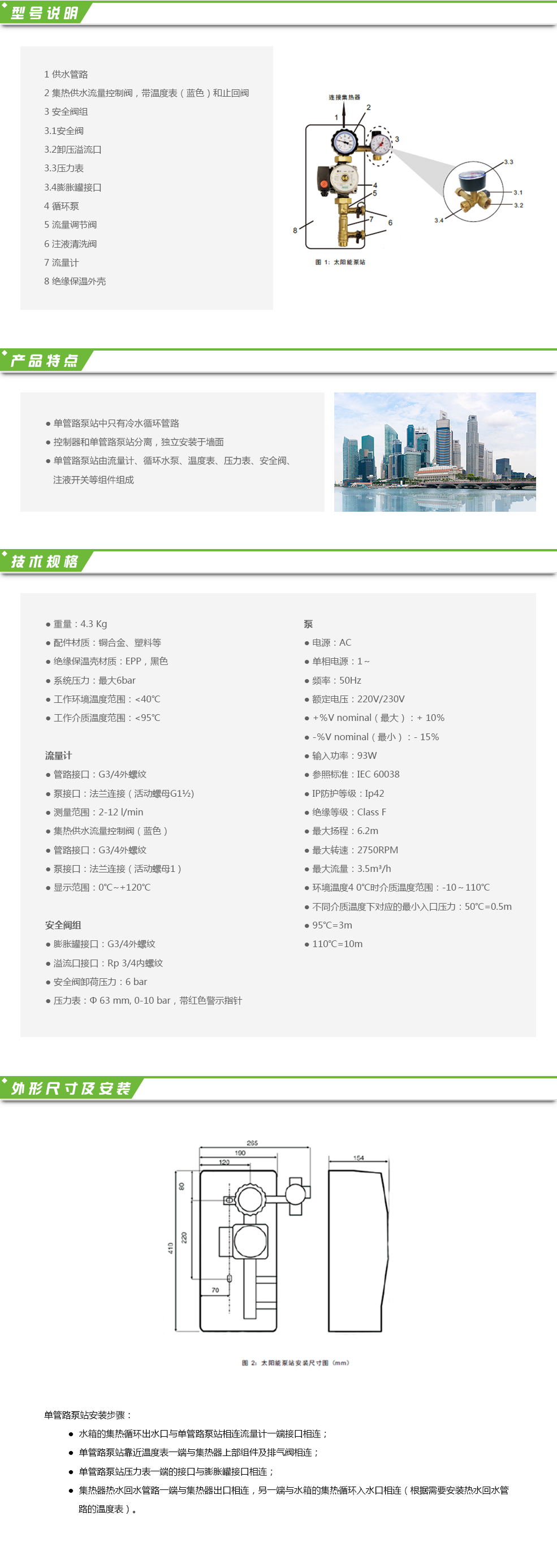 太陽(yáng)能泵站HL-WS-01 用于分體承壓閉合的太陽(yáng)能熱水系統(tǒng),安裝于太陽(yáng)能集熱器的供水管路上,適用于水、水和乙二醇混合物介質(zhì),集成的安全閥組用于防止系統(tǒng)壓力過(guò)高。太陽(yáng)能泵站包含功能性部件、安全保護(hù)裝置和絕緣保溫殼體;產(chǎn)品經(jīng)過(guò)集成裝配、嚴(yán)格的功能測(cè)試和密封性檢測(cè)。
