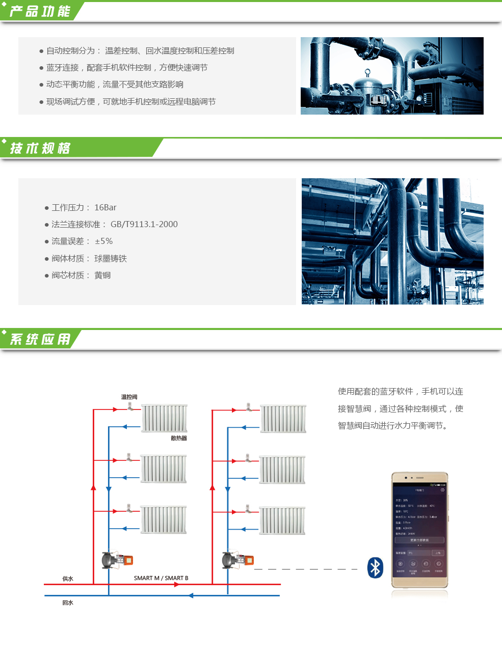 智慧平衡閥SMART B是基于嵌入式軟件、傳感技術(shù)、人工智能算法、流體模擬計算等技術(shù),結(jié)合傳感器、智能控制器、執(zhí)行器和平衡閥等產(chǎn)品優(yōu)勢,實現(xiàn)智能化操作的閥門裝置??蓱?yīng)用于建筑管網(wǎng)動態(tài)流量平衡、動態(tài)壓差平衡、動態(tài)溫度平衡的調(diào)節(jié)控制。