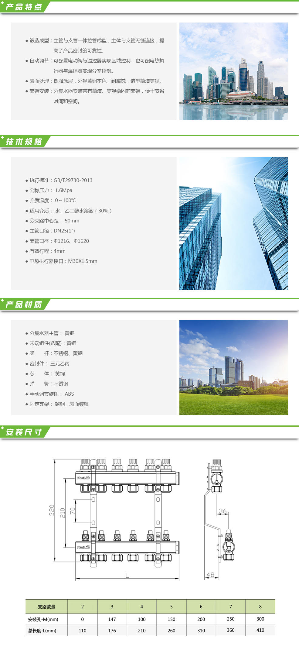 TH36系列分集水器為黃銅整體型材一體式分集水器,適用于地板采暖系統(tǒng),控制輻射地板采暖系統(tǒng)的熱能。分集水器各回路均內(nèi)置了調(diào)節(jié)水量的閥芯??杉友b電熱執(zhí)行器和溫控器實(shí)現(xiàn)獨(dú)立分室溫度控制。用戶根據(jù)需要可自行設(shè)定室溫,溫控器會(huì)自動(dòng)檢測(cè)房間溫度,并向執(zhí)行器輸出信號(hào),關(guān)閉或打開(kāi)此房間的執(zhí)行器,使室溫保持在設(shè)定的范圍內(nèi)。也可以在分集水器主管上加裝電動(dòng)閥,與溫控器配套 ...