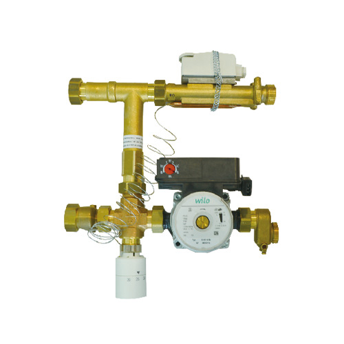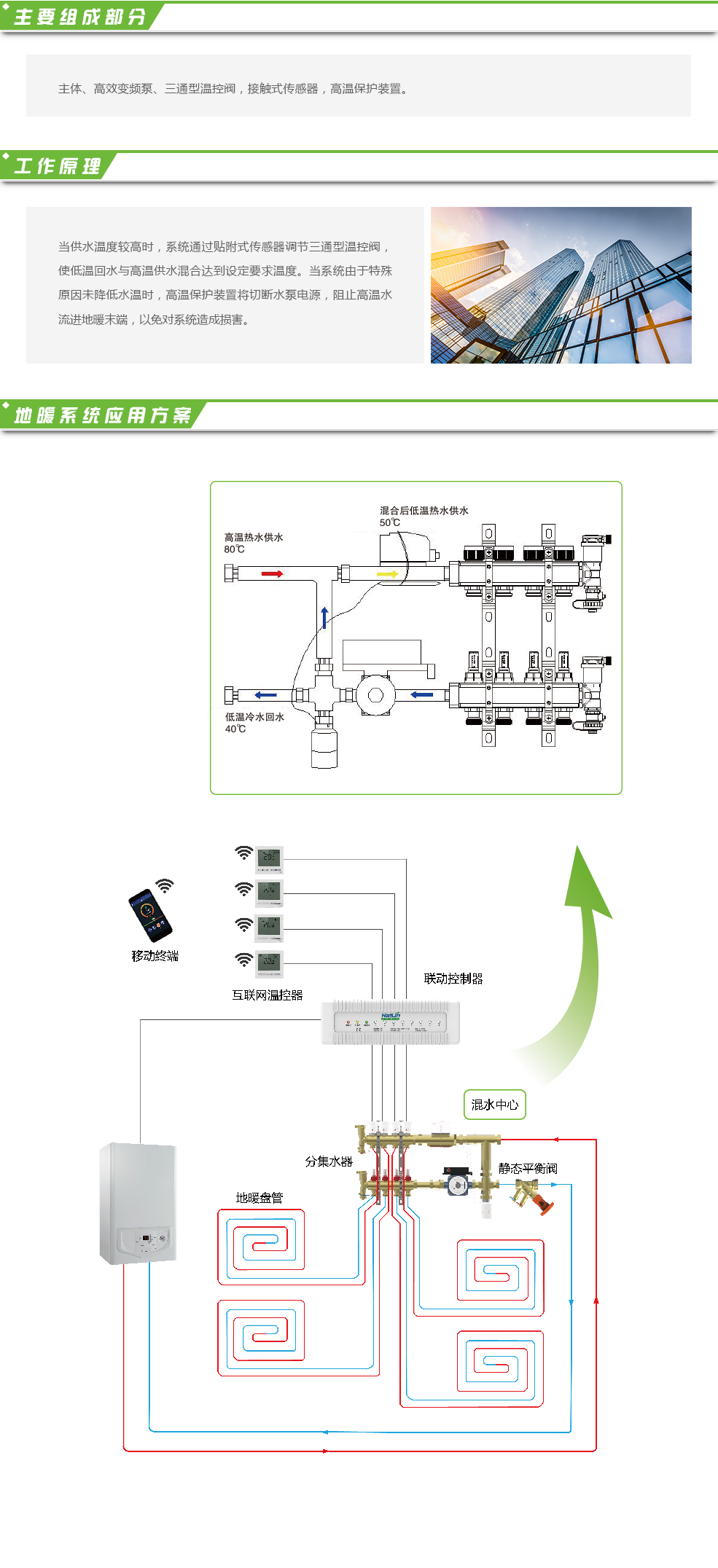 E2505型混水中心是將末端地暖高溫供水降低溫度。例如在改造項(xiàng)目中,采暖末端散熱器與地暖同時(shí)存在,熱源供水溫度較高的系統(tǒng)中,將高溫供水與低溫回水混合,通過傳感器與溫控閥調(diào)節(jié)混合比例,達(dá)到降低供水溫度目的。